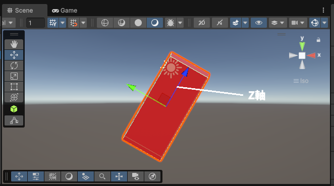 ここでは、以下の赤色のオブジェクトを使って、ローカル座標のZ軸に対して回転する処理を作ってみます。