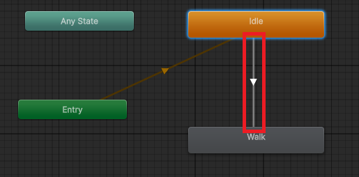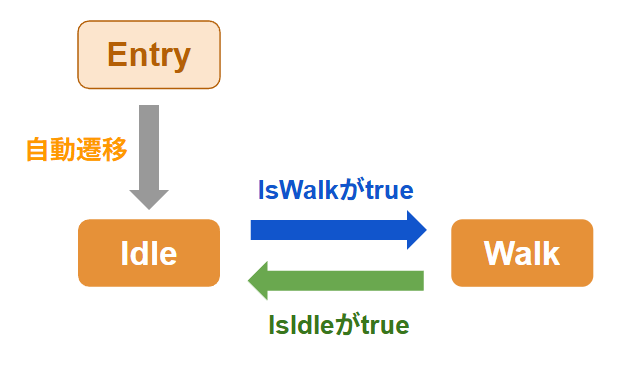 これで、IsWalkがtrueになったらWalkのアニメーションが再生されて、IsIdleがtrueになったらIdleのアニメーションが再生されるようになります。