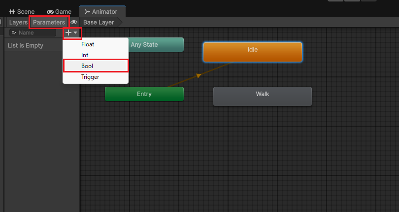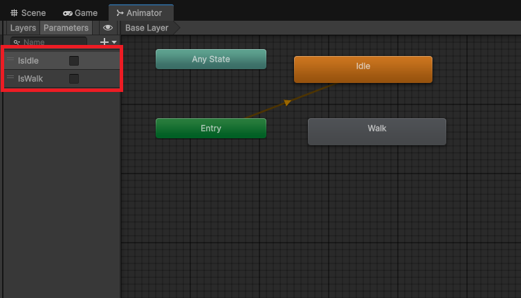 ここでは、最初はIdleのアニメーションに自動遷移させた後に、IdleからWalkに手動で遷移させるパラメーターとして「IsWalk」、またWalkからIdleに遷移させるパラメーターとして「IsIdle」という2つのbool型のパラメーターを作成していきます。