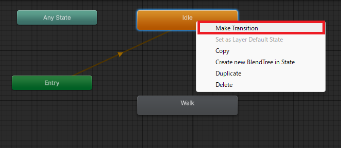 まず、Idleのアニメーションを右クリックして「Make Transition」を選択、