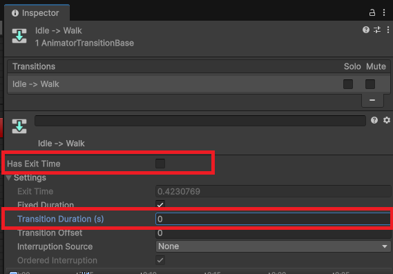 この矢印を選択して、インスペクターウィンドウから「Has Exit Time」のチェックを外し手動で遷移させるようにして、「Transition Duration」の設定を0にしておきます。