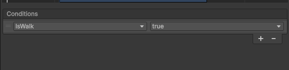 そして、下部にある「Conditions」の+ボタンを押して、IsWalkのパラメーターがtrueになることを遷移条件として設定します。