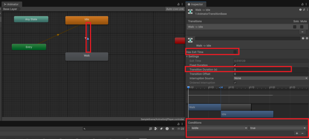 同様に、WalkのアニメーションからIdleのアニメーションへのTransitionも設定しておき、IsIdleのパラメーターがtrueになった際に遷移させるように設定しておきます。