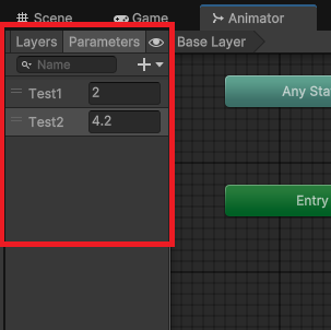 パラメーターを作成する際は、上部にある「Parameters」を押して、+ボタンから「Float」を選択します。