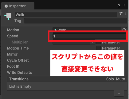もう少し具体的に言うと、AnimatorController上にあるそれぞれのAnimationStateで上記の設定を行うことができますが、スクリプトからは直接値の変更処理を行うことができません。