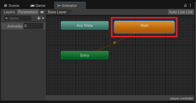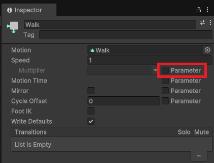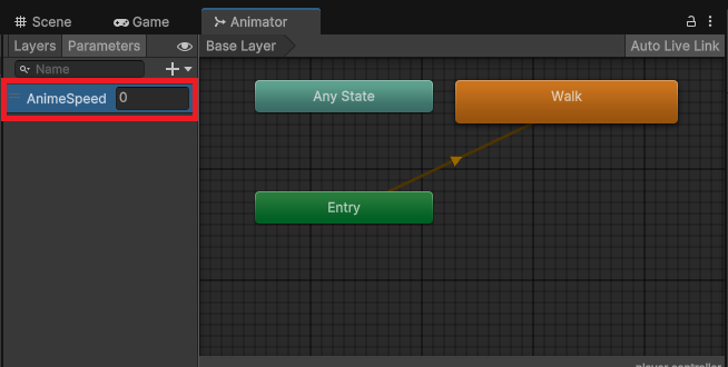 インスペクターウィンドウからSpeedの項目にある「Parameter」にチェックを入れておきます。
