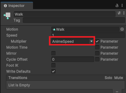 これで、アニメーションの再生速度に対して、設定したパラメーターの値が掛け合わさって(乗算)速度が決定されるようになります。