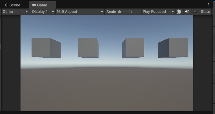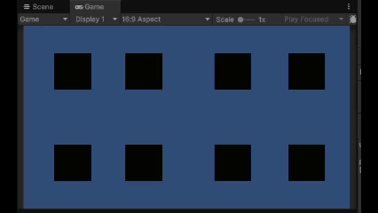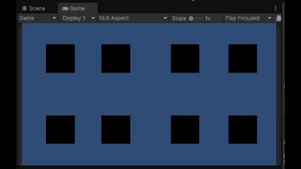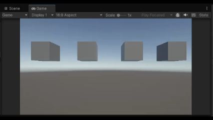 以下のように、四角のオブジェクトを複数配置しておき、ゲーム開始後スペースキーを押したら、それぞれのオブジェクトにRigidbodyコンポーネントが追加されるようにしてみます。