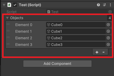}5行目でゲームオブジェクト用の配列をpublicで作り、インスペクターウィンドウからそれぞれのオブジェクトを入れておきます。