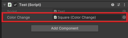 }5行目でColorChange型の変数をpublicで宣言しておき、インスペクターから先ほどのオブジェクトを指定しておきます。