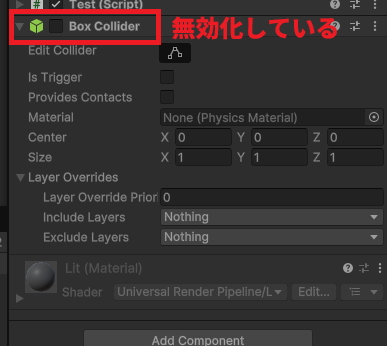 オブジェクトに紐づいているRigidbodyコンポーネントがオフになっているのが分かります。