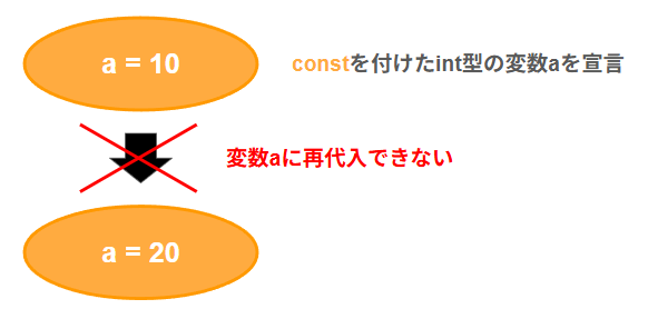 ただ、constを付けた変数の場合は、宣言の最初の段階で値を必ず代入する必要があるため、上記のように記述することはできません。
