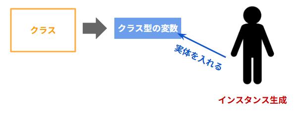 そもそもクラスというのは作っただけでは実行されないため、クラス型の変数を作りその中にインスタンスを生成して入れてあげることで、そのクラスを使うことができます。