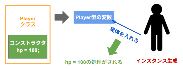 例えば、Playerというクラスを作り、その中で変数hpを100にするというコンストラクタを作っておくことで、Player型のインスタンスを生成した時に、プレイヤーのhpの変数に自動的に100の値を入れて生成することができます。