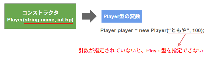 例えば、先ほどのPlayerクラスで、変数nameと変数hpを必ず指定したいという場合に、Playerクラスに引数付きのコンストラクタを設定しておくことで、インスタンス生成時にnameとhpを引数で指定しないと、エラーが発生し入力の忘れを防ぐことができます。