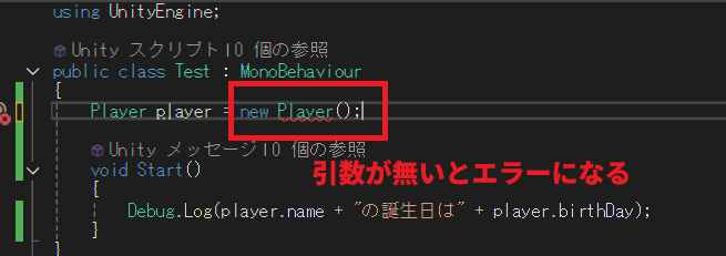 }そして、別のクラスからPlayer型のインスタンスを生成してあげる際に、引数で名前と生年月日を指定しないとエラーが表示されるようになります。