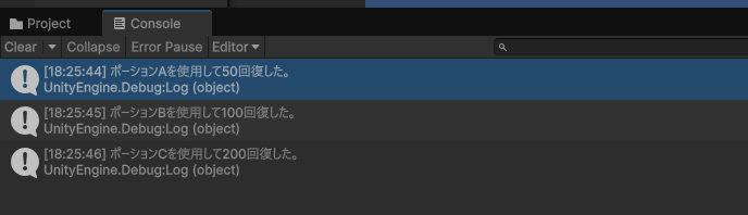 それぞれのアイテムをクリックすると、アイテム名と回復量がコンソールウィンドウに表示されるようになりました。
