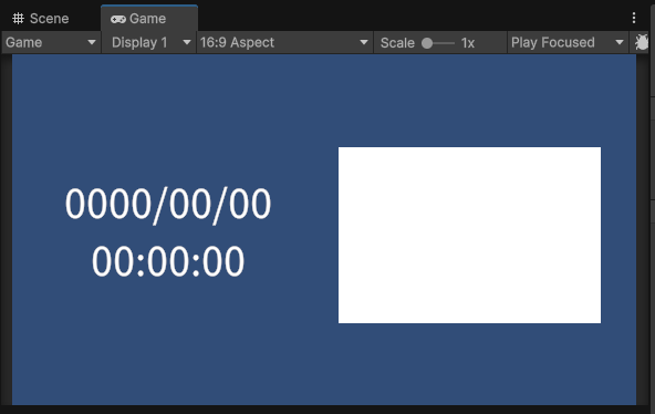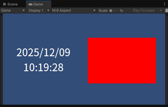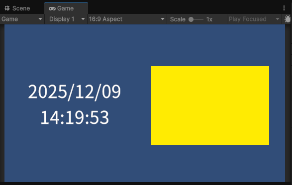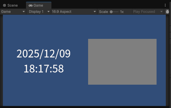 ここでは、上記のプロパティを使って、ゲーム内に現在の時間をリアルタイムで表示させる処理を作ってみます。