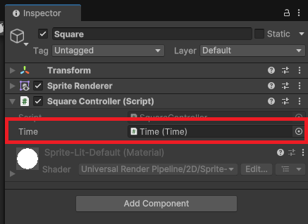 次に、この取得した時間に応じて、四角いオブジェクトの色が変化する処理を作りたいので、以下のスクリプトを四角のオブジェクトにアタッチしていきます。