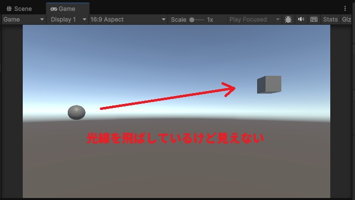 しかし、この光線を飛ばす処理をUnityのスクリプトで実際に記述したとしても、光線自体は透明なものなので、ゲーム画面では本当に光線が想定した向きで飛ばされているかどうかを確認することができません。