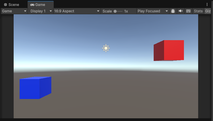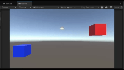 ここでは、スペースキーを押している間、以下の青色のオブジェクトから赤色のオブジェクトに向かって光線を飛ばし、赤色のオブジェクトが青色に変化するという処理を作っていきます。