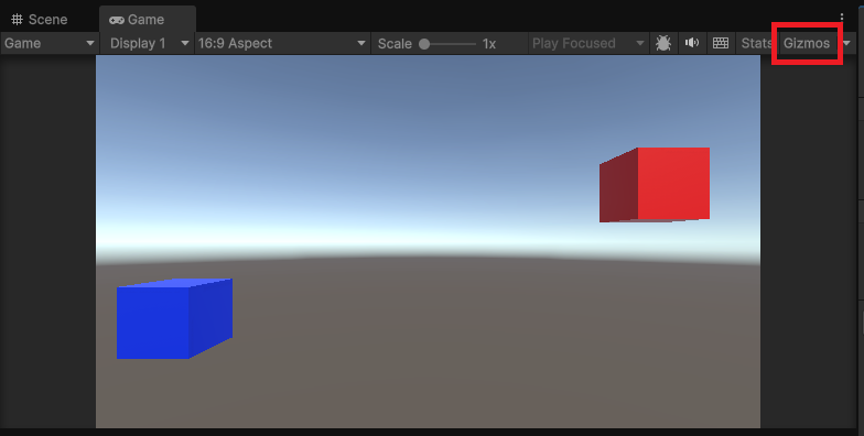 なお、ゲームウィンドウでDrawRayによる線が表示されていない場合は、画面の右上にある「Gizmos」をクリックしてあげることで、表示されるようになります。