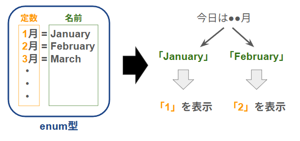 例として、1月から12月のそれぞれの値に対して、名前を付けてenum型を定義しておくことで、次からは名前を書くだけでその月の値を取得したり表示したりすることができるようになります。