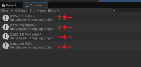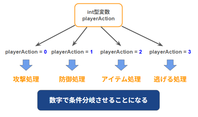 この時に、プレイヤーが選択するint型の変数を作り、「0」「1」「2」「3」の値とそれぞれのアクションを紐づけておくことで、以下のようにゲーム内の処理を作ることができます。