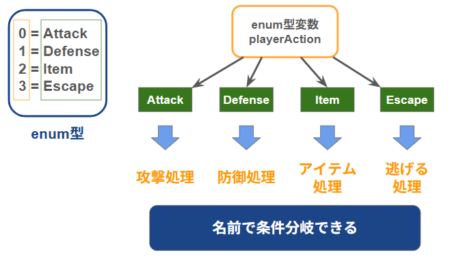 そして、enumを使うことで、例えば、ゲーム内で決まっているアイテムやプレイヤーのアクションなどをスクリプトの中で、名前で管理することができるようになります。