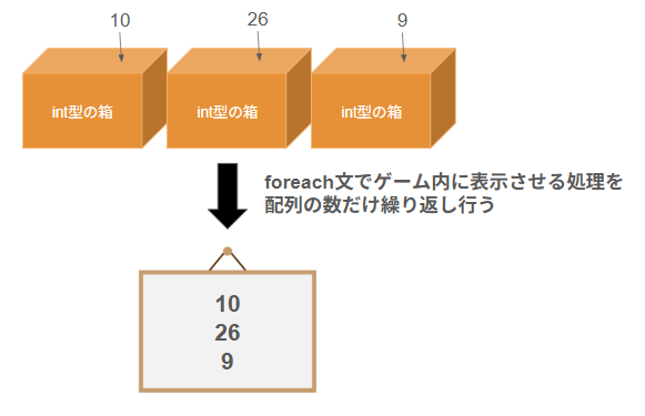 例えば、上記のようにint型の配列を作っていた場合に、foreach文を使うことで、上から順番に全ての要素の数値を表示させていくといった処理を作ることができます。