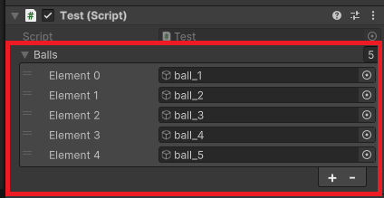 }スクリプトの中の6行目で、GameObject型の配列をpublicを付けて定義していて、この中にボールのゲームオブジェクトをインスペクターウィンドウから入れておきます。