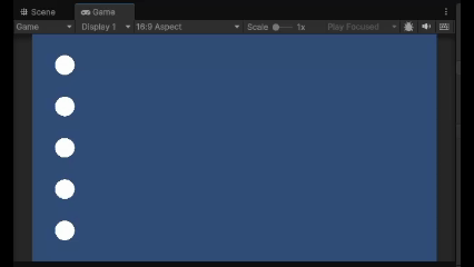 以下のように、ボールを5つ準備しておき、それぞれのオブジェクトに対して、移動用のスクリプトを紐づけておきます。
