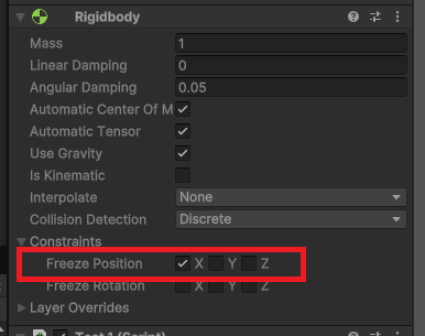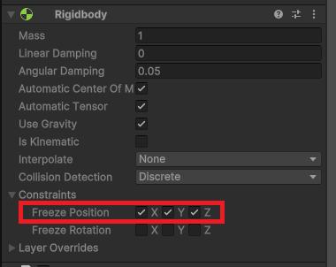 このFreeze Positionを使うことで、Rigidbodyのオブジェクトが想定していない動きや移動をしないように制御することができます。