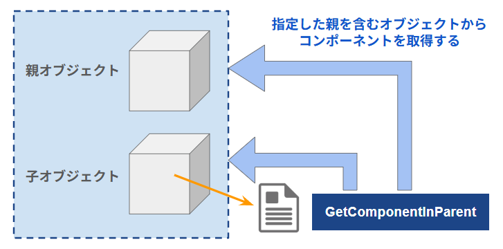 一方で、GetComponentInParentは、名前の通り、指定したオブジェクトの親オブジェクトからコンポーネントを検索して取得できるメソッドになっています。