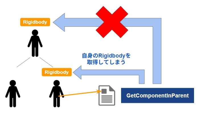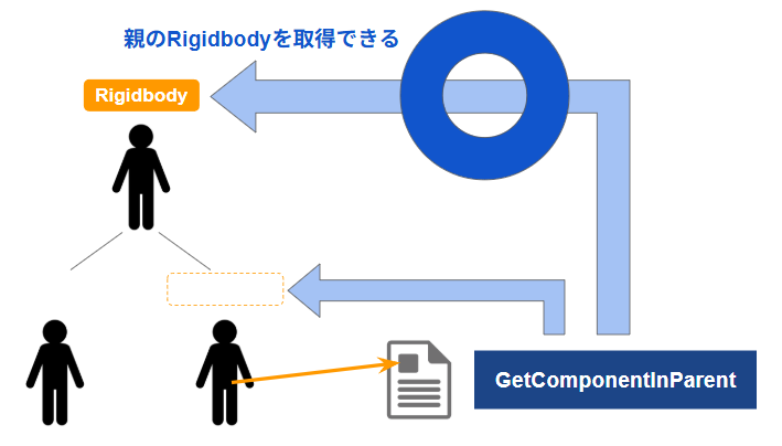 例えば、GetComponentInParentを使って、親オブジェクトのRigidbodyコンポーネントを取得しようとします。