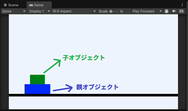 親オブジェクトに対して移動する処理が行われることで、子オブジェクトも一緒に移動しているのが分かります。