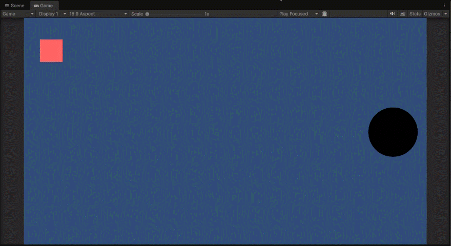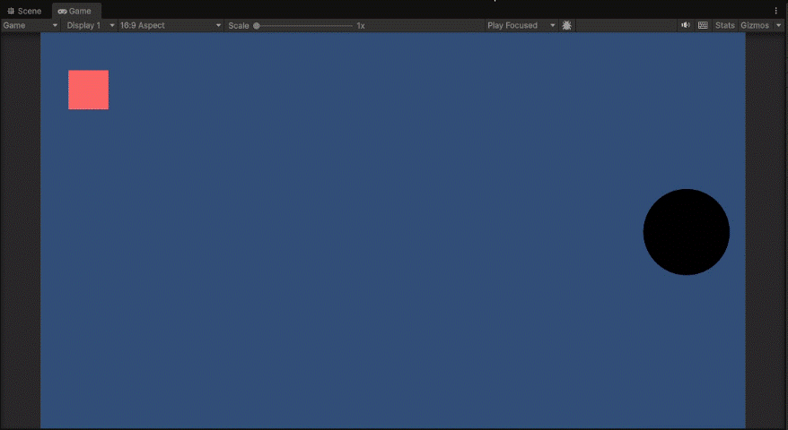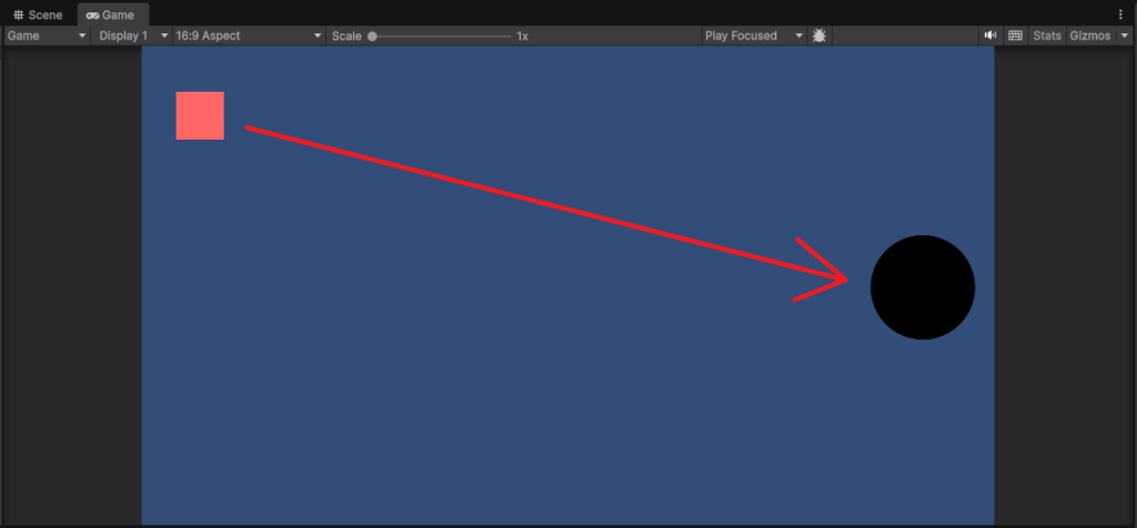 ここでは2Dゲームで、以下の赤色の四角いオブジェクトが黒色の丸いオブジェクトの位置まで徐々に加速して移動する処理を作ってみます。