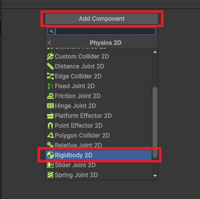 オブジェクトを選択した状態で、インスペクターウィンドウのAddComponentから「Rigidbody 2D」を選択します。