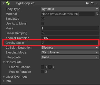 Rigidbody2Dを紐づけたら、今回はオブジェクトを移動させるだけで重力を設定する必要が無いため、「Gravity Scale」の値を0にしておきます。