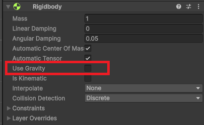 なお、3Dゲームの場合はコンポーネントで「Rigidbody」を選択して、「Use Gravity」のチェックを外しておきます。
