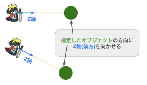 もう少し具体的に言うと、自身のオブジェクトのZ軸が正となる向き(前方)を、指定したオブジェクトがいる方向に回転させるTransformコンポーネントで定義されているメソッドです。