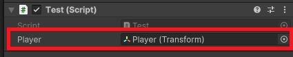 5行目でプレイヤーのTransformを取得する変数をpublicを付けて宣言して、インスペクターウィンドウからプレイヤーを指定しておきます。