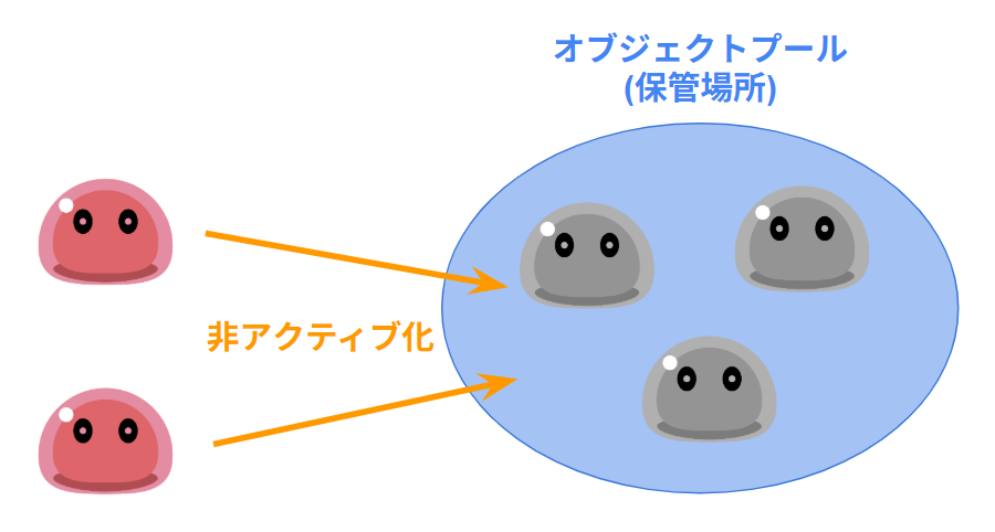 もう少し詳しく言うと、まずオブジェクトが不要となったタイミングで、ステータスを非アクティブ化して保管場所となるオブジェクトプールに入れておきます。