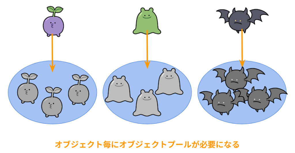 ただし、このオブジェクトプールを使う場合、1つのプールの中では1つのオブジェクトを管理することになるため、ゲーム内で複数のオブジェクトを再利用したいような場合は、そのオブジェクトの数だけオブジェクトプールを準備する必要があります。