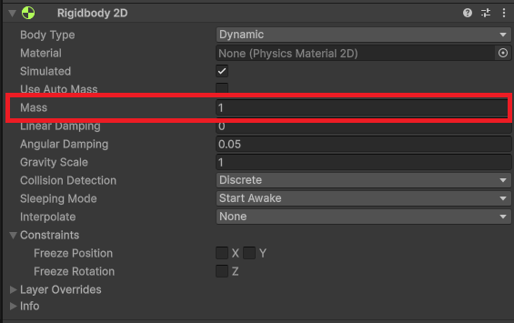 また、全てのコインにインスペクターウィンドウからRigidbody2Dコンポーネントを付けておき、コイン毎に重さ(mass)の値を変えておきます。