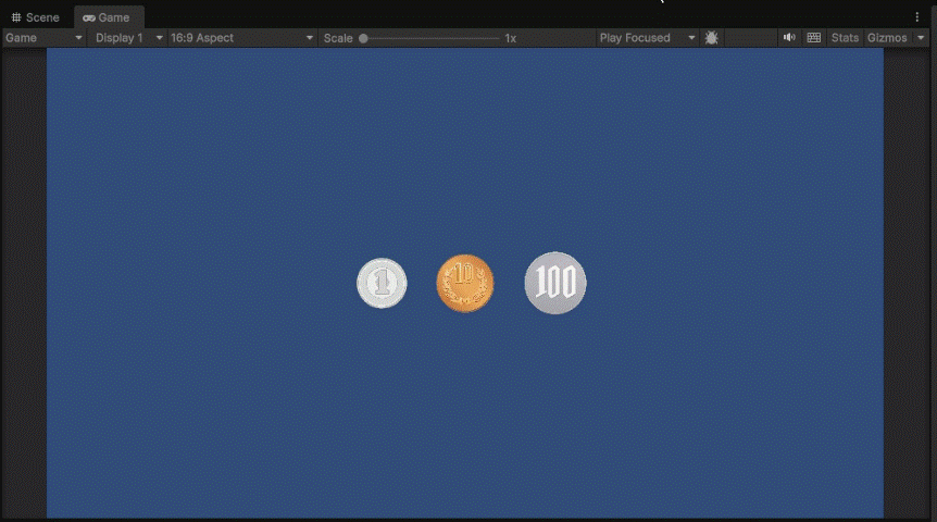 まずは、それぞれのコインのオブジェクトをシーン内に配置して、以下のスクリプトをアタッチしておきます。