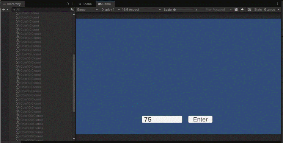 ちなみに最終的に作るものとして、画面内に設置したEnterボタンを押したら入力した数字の数だけ、コインのオブジェクトを再利用して表示されるという処理を作ってみます。