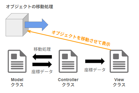 一方で、MVCモデルで設計している場合、キー操作による入力はControllerクラスで記述し、オブジェクトの座標の移動の計算をModelで行い、その結果をControllerでViewに渡して表示させることになるので、3つのクラスを作ることになり手間がかかるのが分かります。