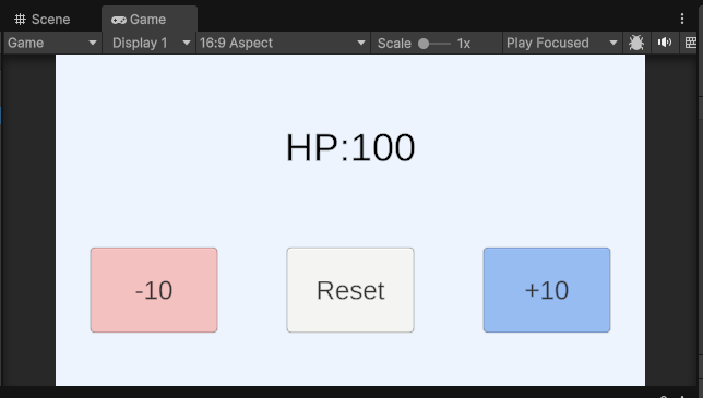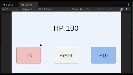 ここでは、以下のようにHPを表示させて、その下のボタンを押すとHPの値が変更されていくという処理を作ってみます。