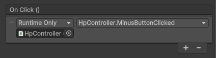 あとは、今回Buttonオブジェクトを使っているので、Unityで定義されているOnClickイベントを使って、ボタンが押されたらHpControllerで定義したメソッドを呼び出すようにしています。